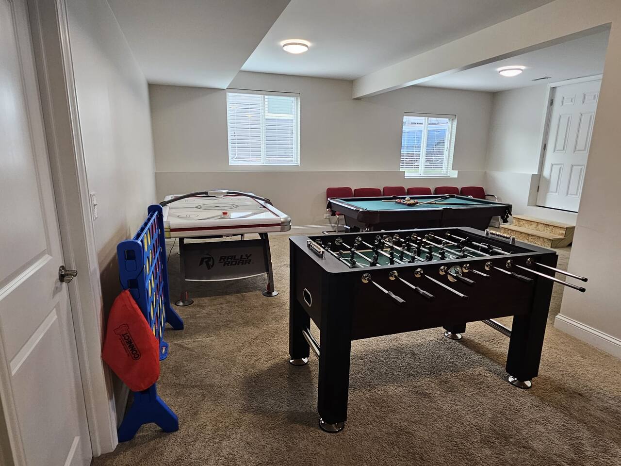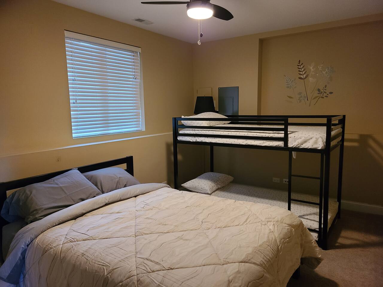Master Bedroom with King Size Bed and attached full bathroom. 2nd bedroom has One queen size bed. 3rd bedroom has One queen and one twin xl bunk bed. 4th bedroom has One queen and one twin xl bunk bed. This room also has a full attached bathroom. There is a full Kitchen with all the kitchen accessories. There is a living room with Sofas and TV. There is a basement with chairs and a Pool table for your enjoyment.